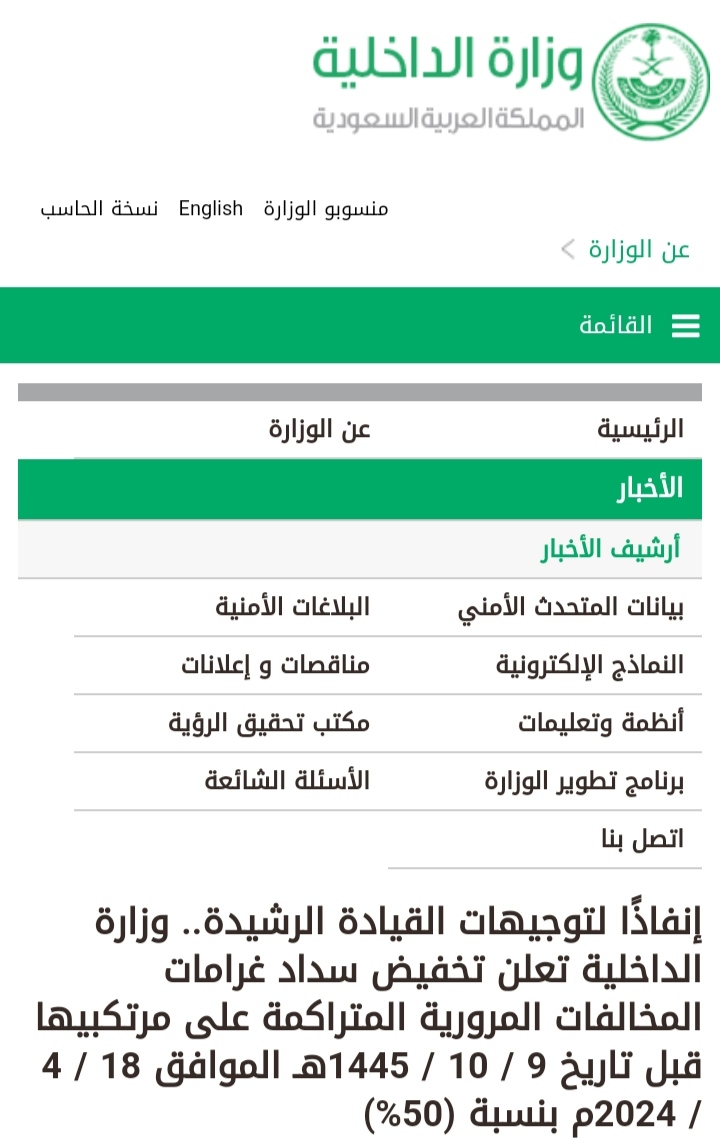 تقوم الإدارة العامة للمرور في المملكة العربية السعودية بتنفيذ توجيهات الملك سلمان بن عبدالعزيز خادم الحرمين الشريفين ومعه ولي العهد الأمير محمد بن سلمان رئيس مجلس الوزراء بتخفيض الغرامات المرورية بنسبة 50%، وذلك بداية من الثامن عشر من شهر أبريل الجاري لعام 2024 وذلك من أجل التخفيف على الكثير من المواطنين من أجل تحقيق رؤية المملكة 2030.