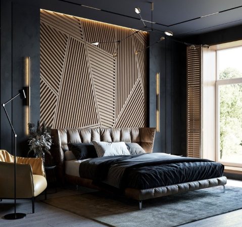 من الأفكار العصرية عند تصميم غرف النوم حيث تكل الغرفة إلى الخارج من خلال نافذة كاملة من الزجاج، واختيار اللون الاسود في الجدران مختلف، كما ساعد الديكور الخشبي خلف السرير على زيادة جمال الغرفة.